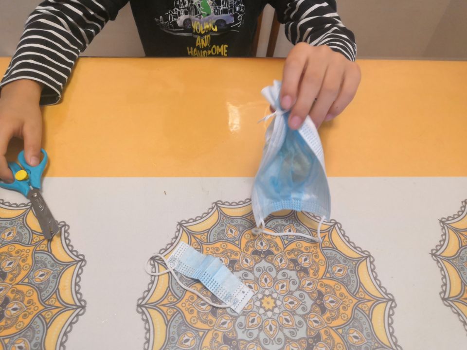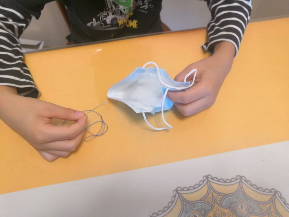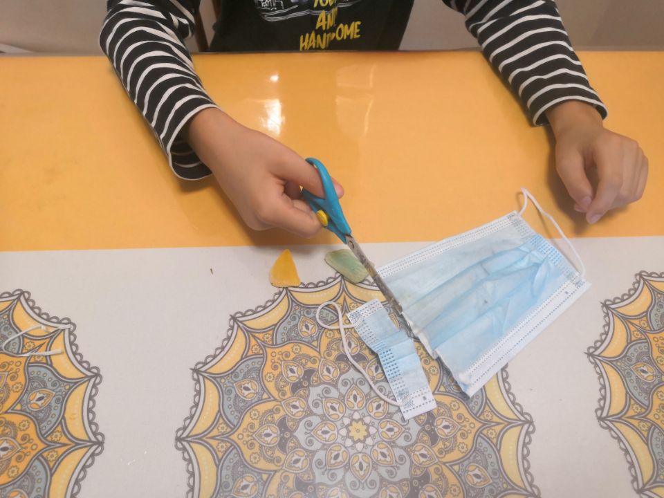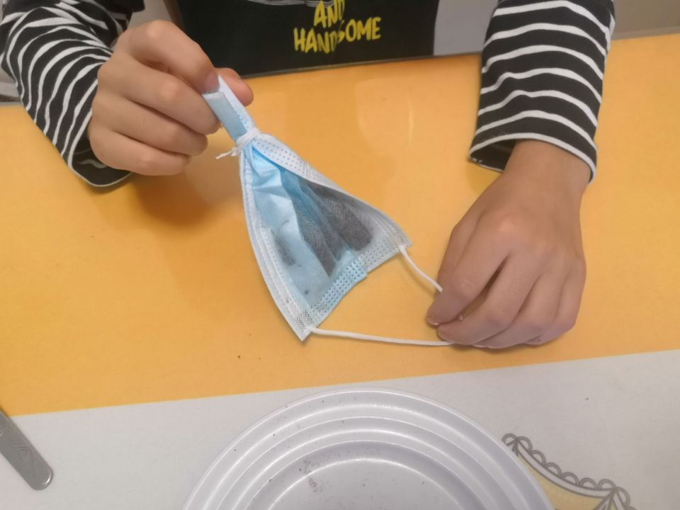 第一步:首先我们准备一个用过的一次性口罩,再拿出家里的针线,先将一次性口罩从中间对